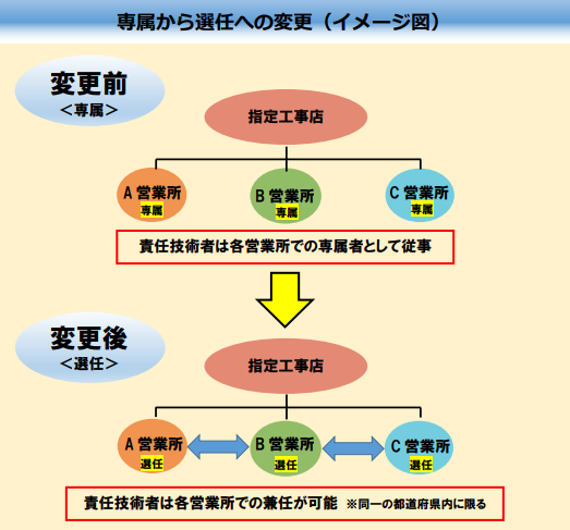 これまで、排水設備工事責任技術者は、排水設備指定工事店の営業所ごとに専属となっていましたが、今回の改正により、令和7年4月1日から同一指定工事店の複数営業所での兼任が可能になります。