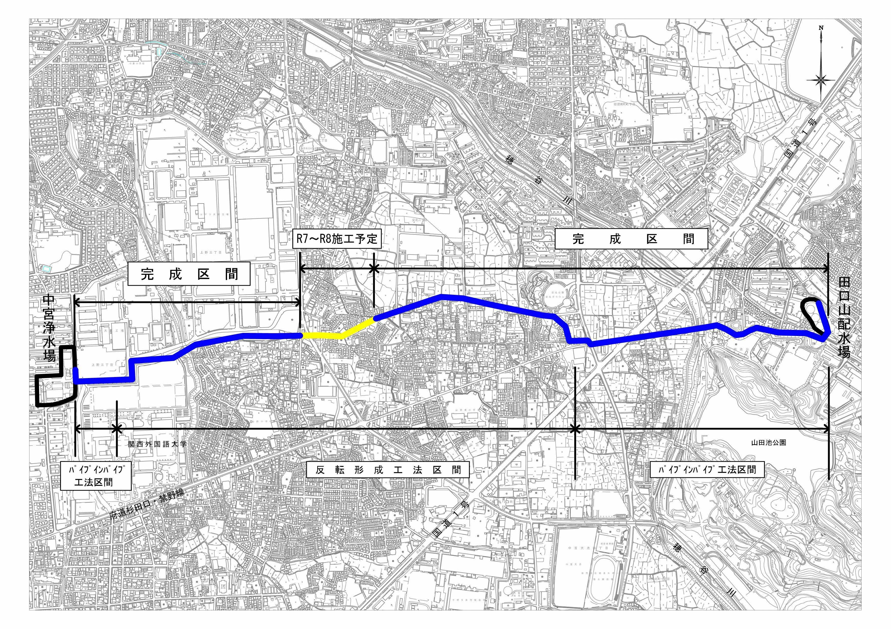 この水道管は昭和40年に布設された中宮浄水場から田口山配水場への送水管で、工事完成後は、片鉾、中宮地区へ水道水を送る配水管として使用し、緊急時には平成24年度から運用を開始した中宮浄水場から田口山配水場への新送水管のバックアップ管として運用するものです。