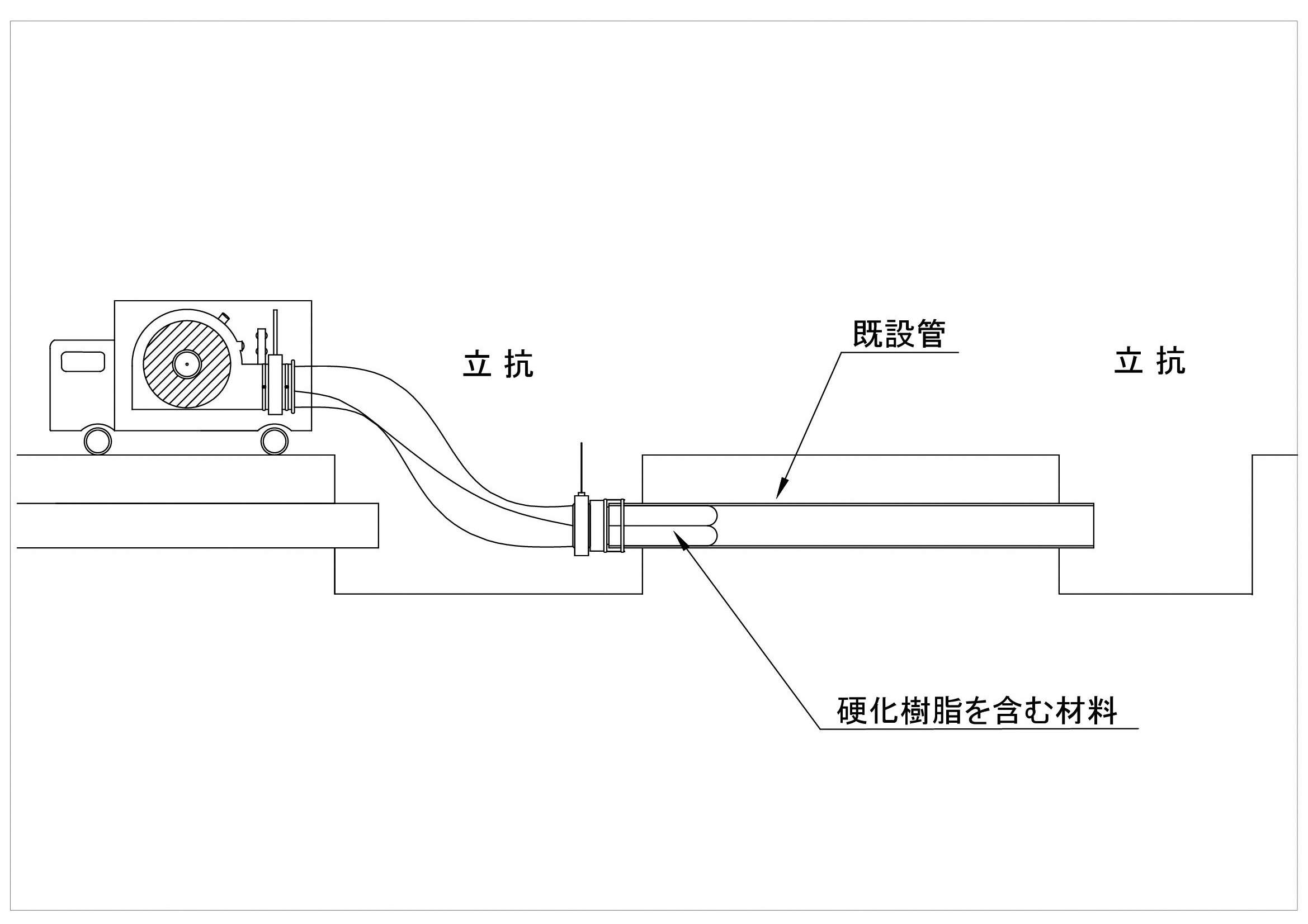 硬化樹脂を含ませた材料を老朽水道管に反転させながら挿入し、内面から圧力をかけて硬化させ、内面に新しくパイプを形成する工法