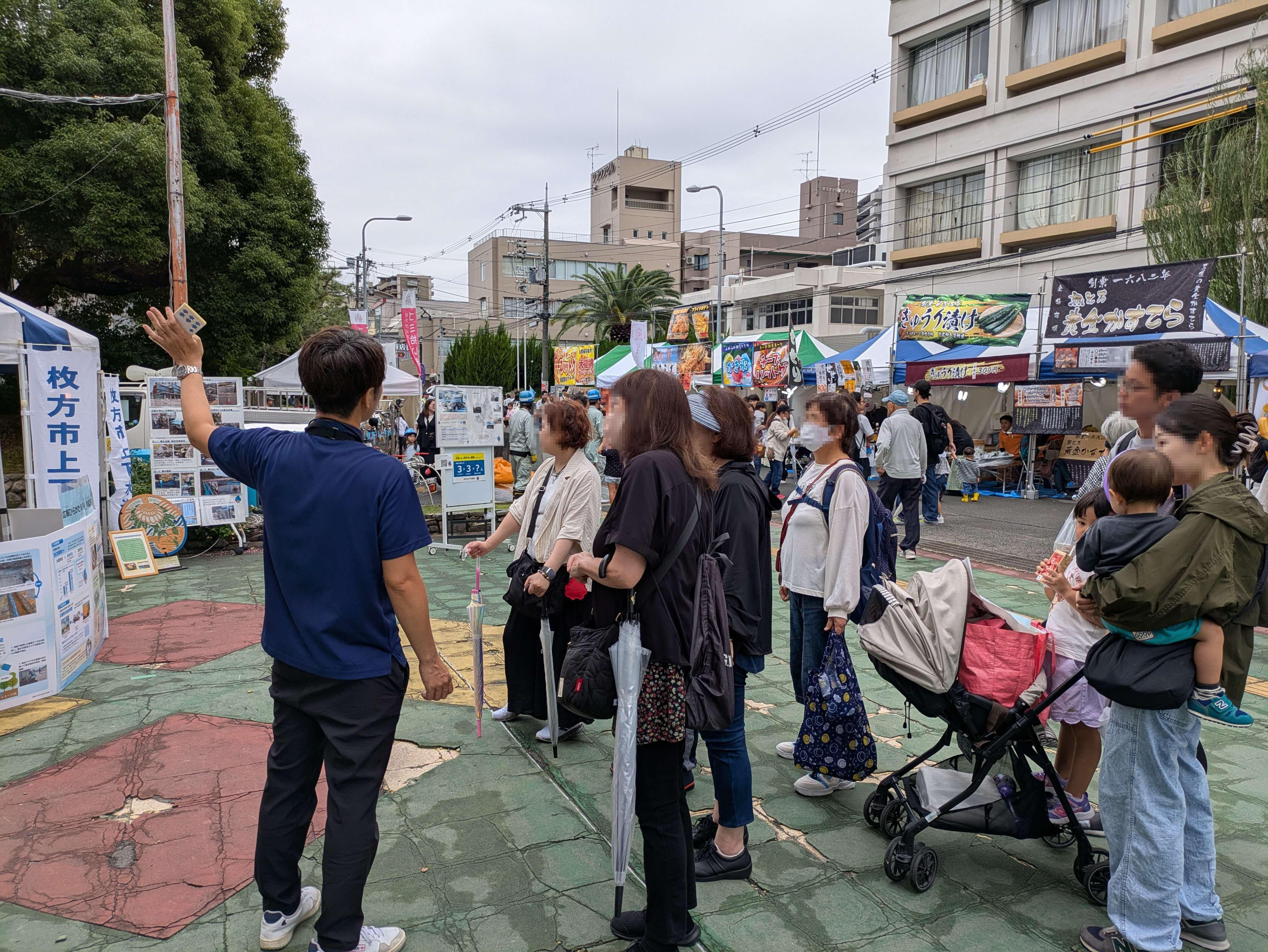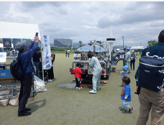 本ブースは、枚方市上下水道局の各種取り組みについて、市民の皆さまに理解を深めていただくことを目的とし、「枚方の水」のおいしさを体感できる利き水体験、能登半島地震時に実施した穴水町への給水活動のパネル展示、給水車による圧送訓練の実演や下水道クイズ等を実施しました。