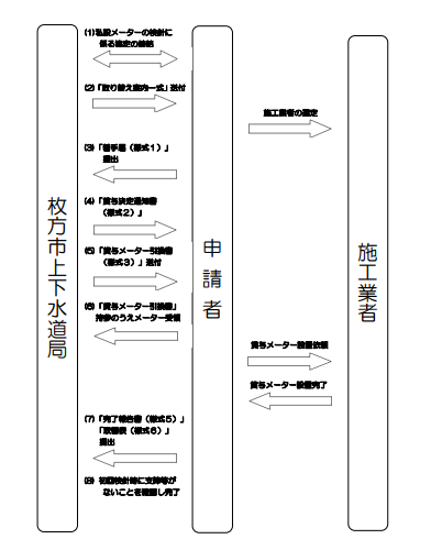 (6)申請者は、送付のあった「貸与メーター引換書」を枚方市上下水道局に提出し、貸与メーターを受領。申請者は、貸与メーター受領後速やかに貸与メーターを設置。(この時、枚方市上下水道局指定給水装置工事事業者でない場合、別途、給水装置工事主任技術者免状の写しを提出。)