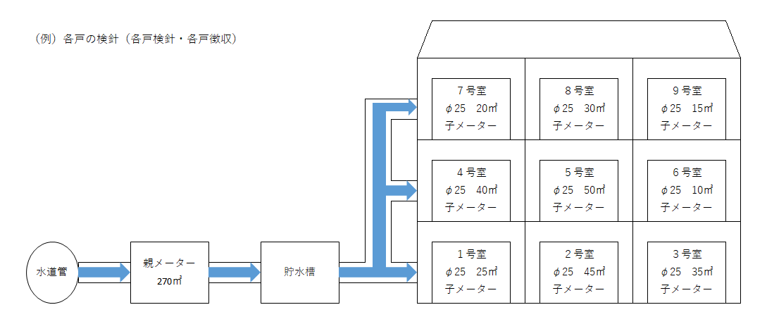 本市では集合住宅等において、「親メーターのみの検針を行う方法(均等割)」と「各戸の検針を行う方法(各戸検針・各戸徴収)」の2種類の検針方法があります。
