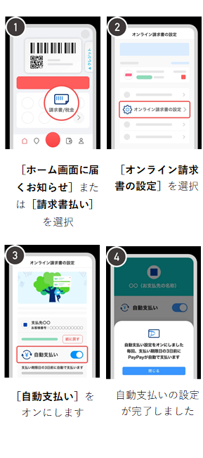自動支払い機能とは、オンライン請求書サービスに登録した支払い先から、PayPayアプリ内に届いた請求書を支払い期日の3日前にPayPayが自動で決済する機能です。支払い日を指定することもでき、オンライン請求書で支払い期日を気にせず、スマートにお支払いをすることができます。