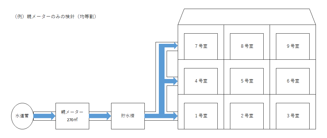 均等割とは、上下水道局が設置したメーター(親メーター)のみを検針し、使用水量を届出戸数で均等に使用したものとして水道料金及び下水道使用料の計算を行い、所有者(オーナーまたは管理会社)に一括してご請求する制度です。