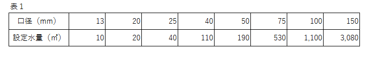 4.直近1年間の平均使用水量(ひと月)が表1の各口径別の設定水量以下であること。 または、直近1年間※の最大使用水量(ひと月)がみなそうとする口径の次に大きい口径の設定水量未満であること。(※使用期間が1年 未満の場合は予定使用水量)