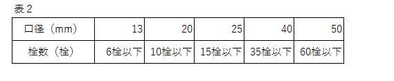 5.令和3年3月31日までに、大口径の戸建て住宅の給水装置工事(改造)又は水栓を減らす工事が完了し、申請時の栓数が表2のみなそうとする口径の区分の栓数以下であること。令和3年4月1日以降に、大口径の戸建て、住宅の水栓を減らす工事が完了し、申請時の栓数が表2のみなそうとする口径区分の栓数以下であること。