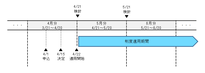 <制度適用決定日以降の検針日(4月21日)の翌日から適用開始の場合>