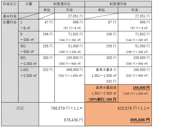 ・基準水量を超える使用水量に対し、従量料金を50%割引します。