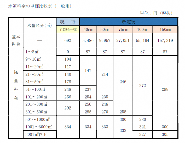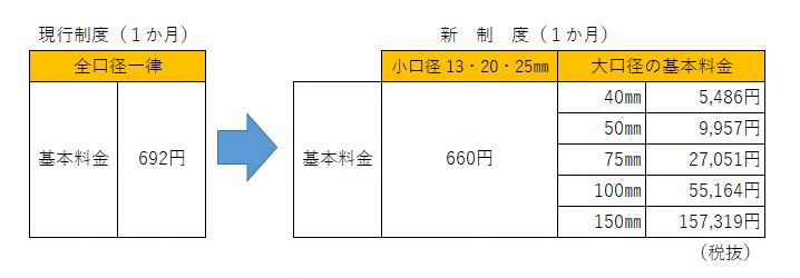 今回の主な見直しとして、水道メーターの口径が大きくなればなるほど、維持管理にかかる費用も大きくなることを踏まえ、公平性の確保を図る観点から、口径ごとに基本料金として相応の費用負担をいただくこととなります。