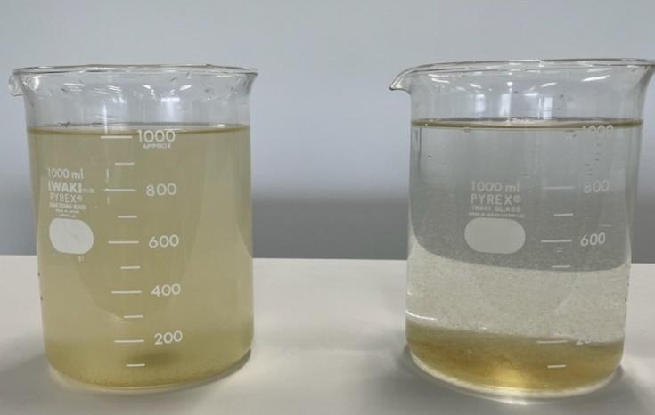 左のビーカーのような淀川の水(原水)に凝集剤PAC(ポリ塩化アルミニウム)を加え、画像の右のビーカーのようにフロックと呼ばれる汚れのかたまりが出来る様子を、実験を通して体験していただきます。