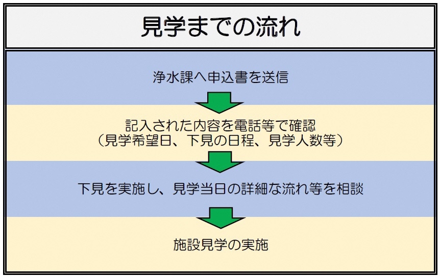 見学の申込みを希望される方は、以下の書式をダウンロードしていただきまして、記入後にFAXかメールにて浄水課まで送信をお願いします。(連絡先電話番号・FAX番号・メールアドレスは申込書に記載しております。)その後、詳細な日程の調整や受入れ可能かどうかをご相談させていただきます。