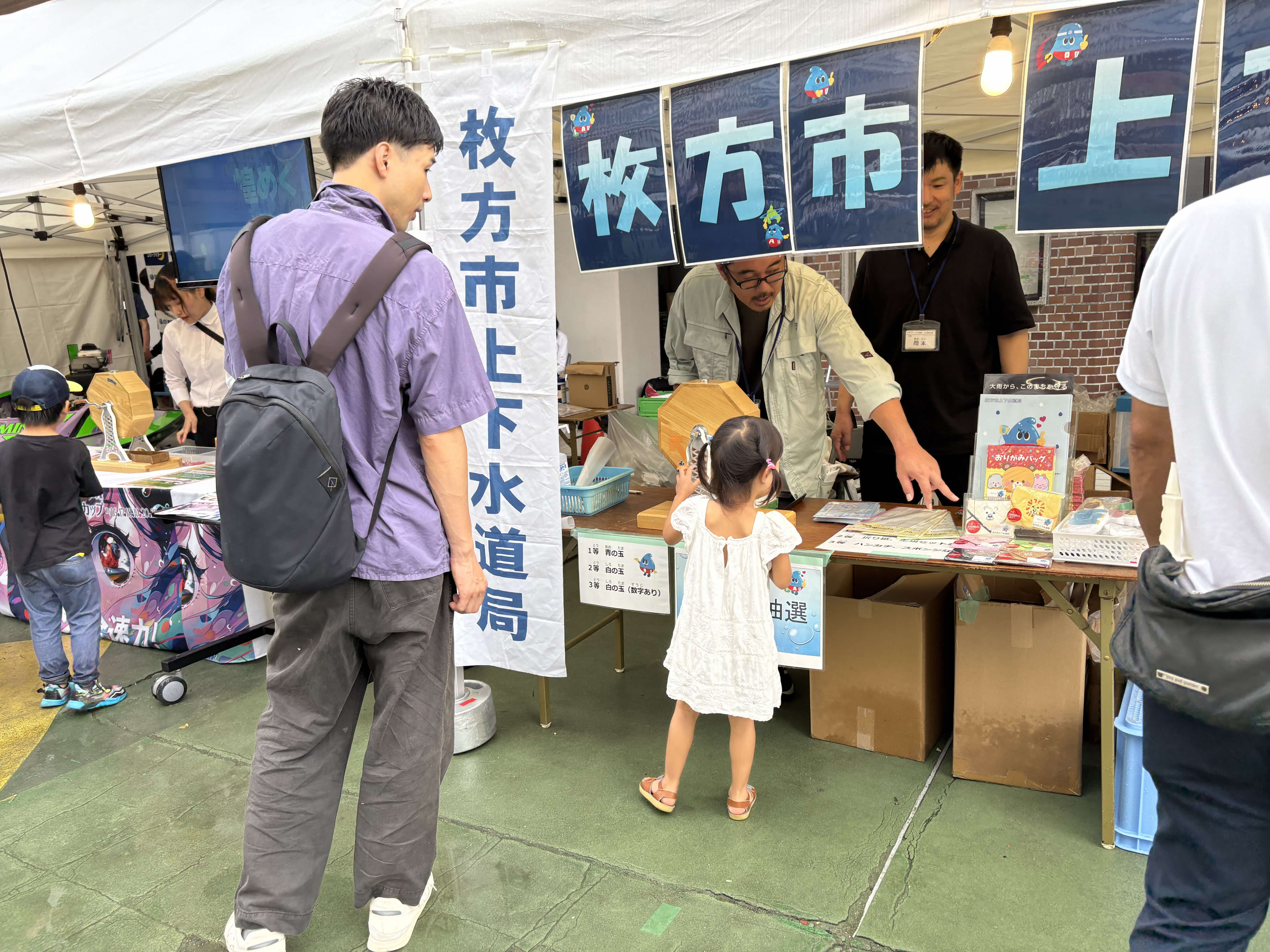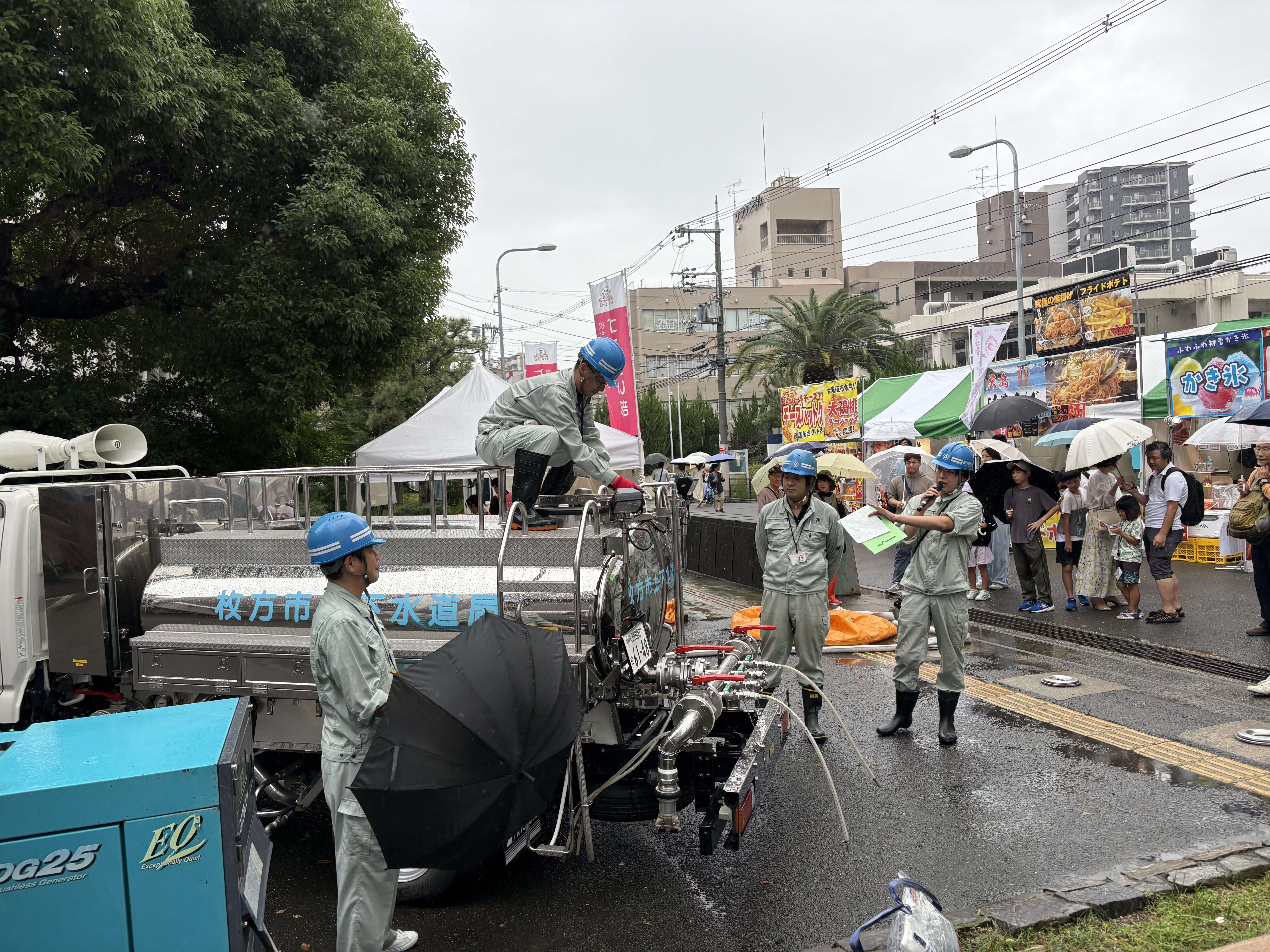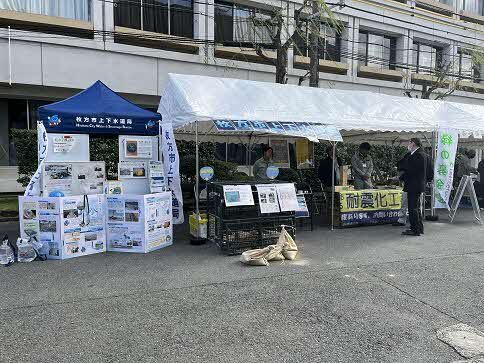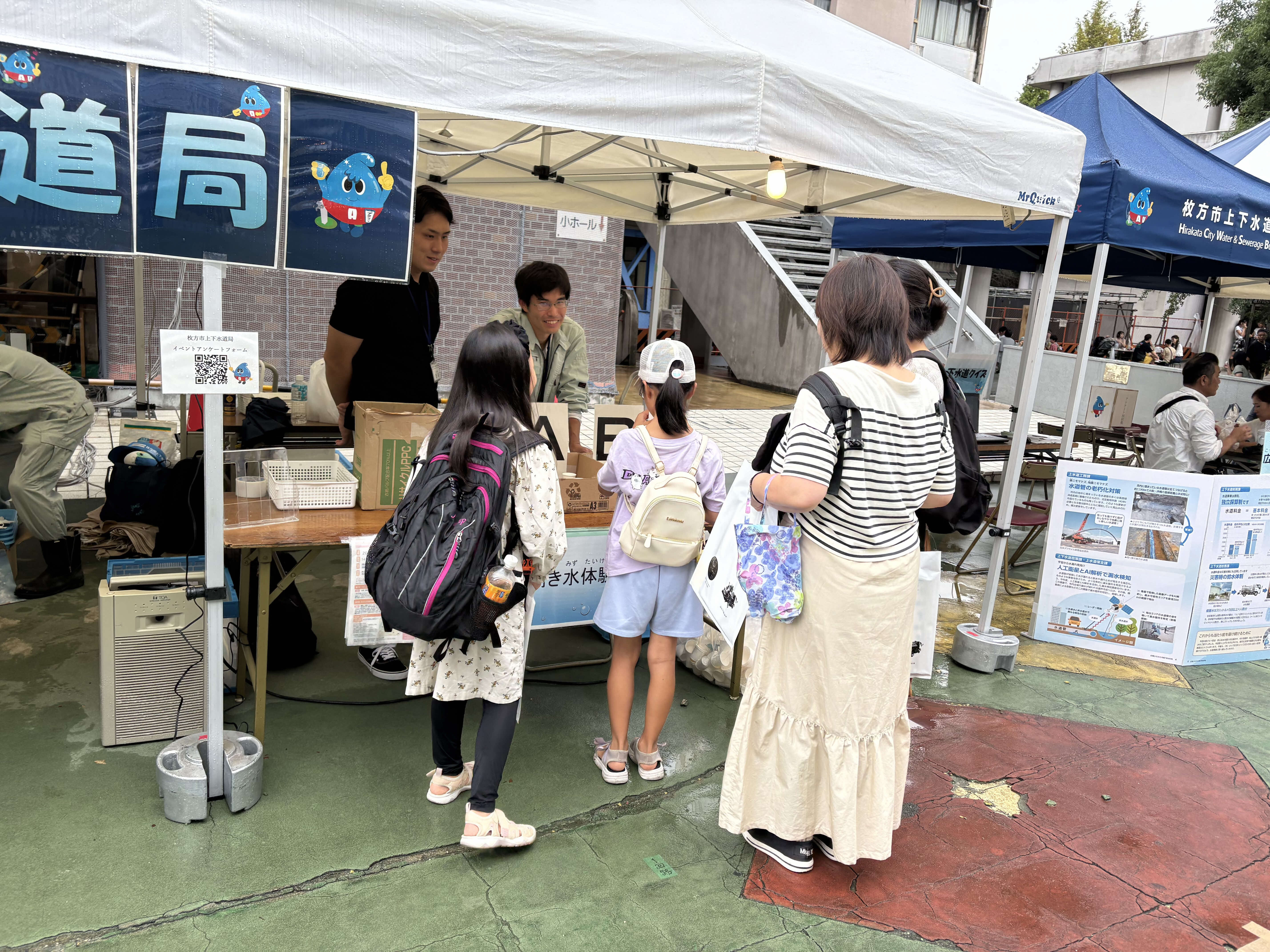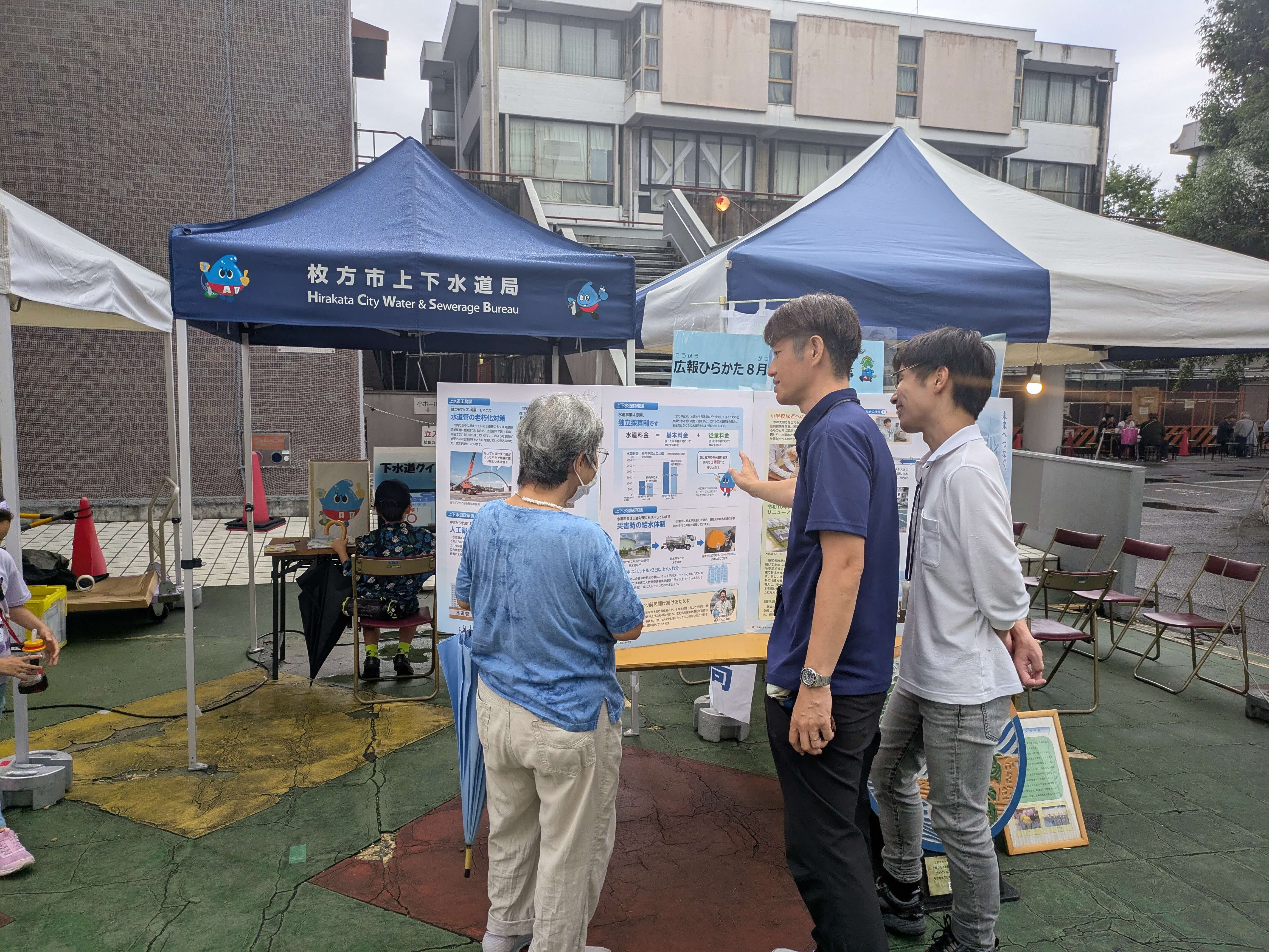 本ブースは、枚方市上下水道局の各種取り組みについて、市民の皆さまに理解を深めていただくことを目的とし、「枚方の水」のおいしさを体感できる利き水体験、能登半島地震時に実施した穴水町への給水活動のパネル展示、給水車による圧送訓練の実演や下水道クイズ等を実施しました。