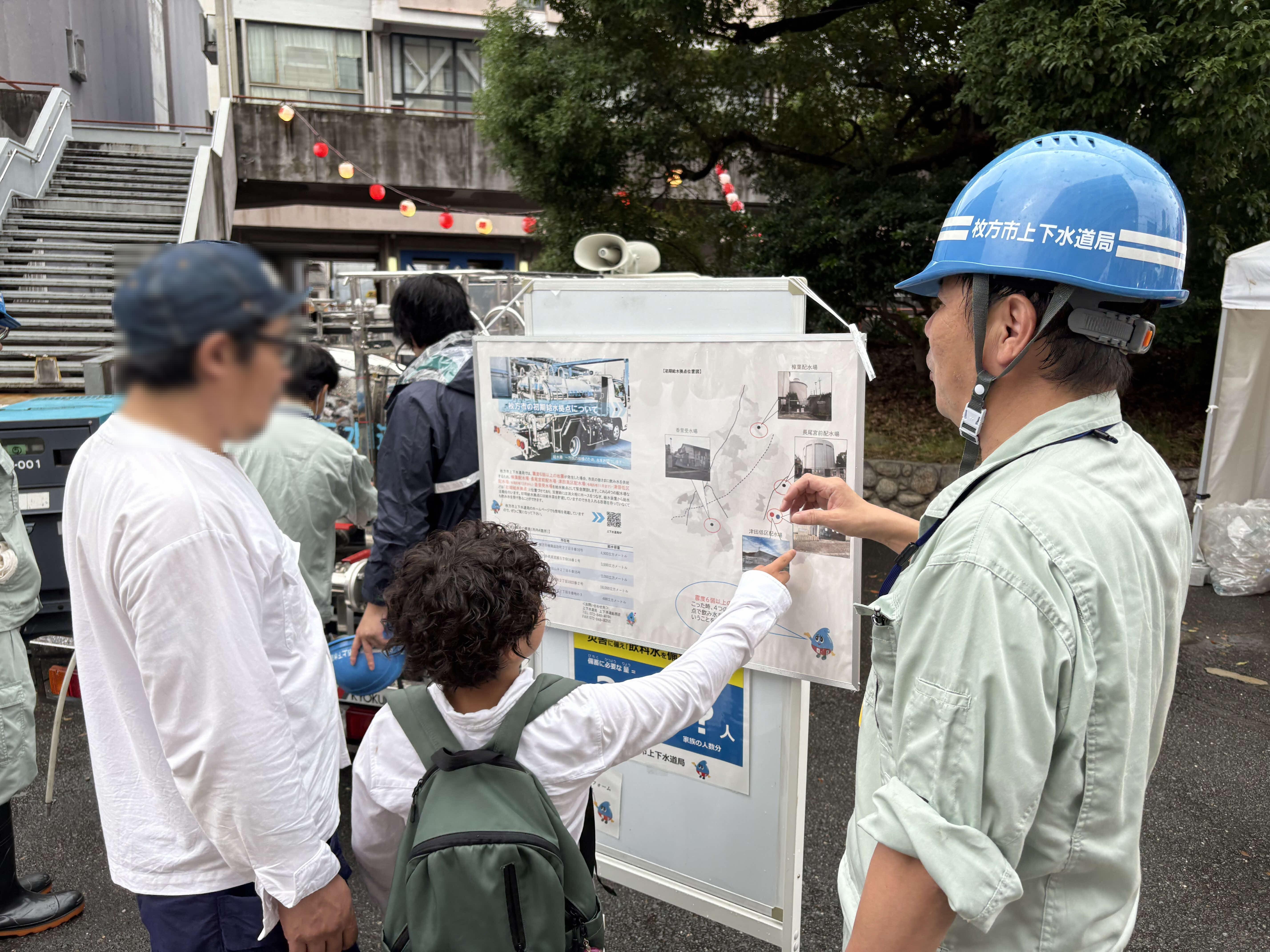 特に「利き水体験」では、A・B2種類の水「枚方の水(水道水)」と「市販のミネラルウォーターを飲み比べてもらい、参加者からは、「普段から枚方の水を安心して飲んでいますよ!」「どちらもおいしい!」といったご意見をいただきました。また、給水車を使用した給水活動の実演においては、各避難所施設に配備されている給水バルーンへ圧送する手順のデモンストレーションを実施しました。このような内容を通じた取り組みにより、市民の皆さまに、少しでも災害発生時に上下水道局における迅速な給水対応が可能であることや、災害対策としての備蓄水確保の必要性について、再認識をしていただけく機会となれば幸いです。