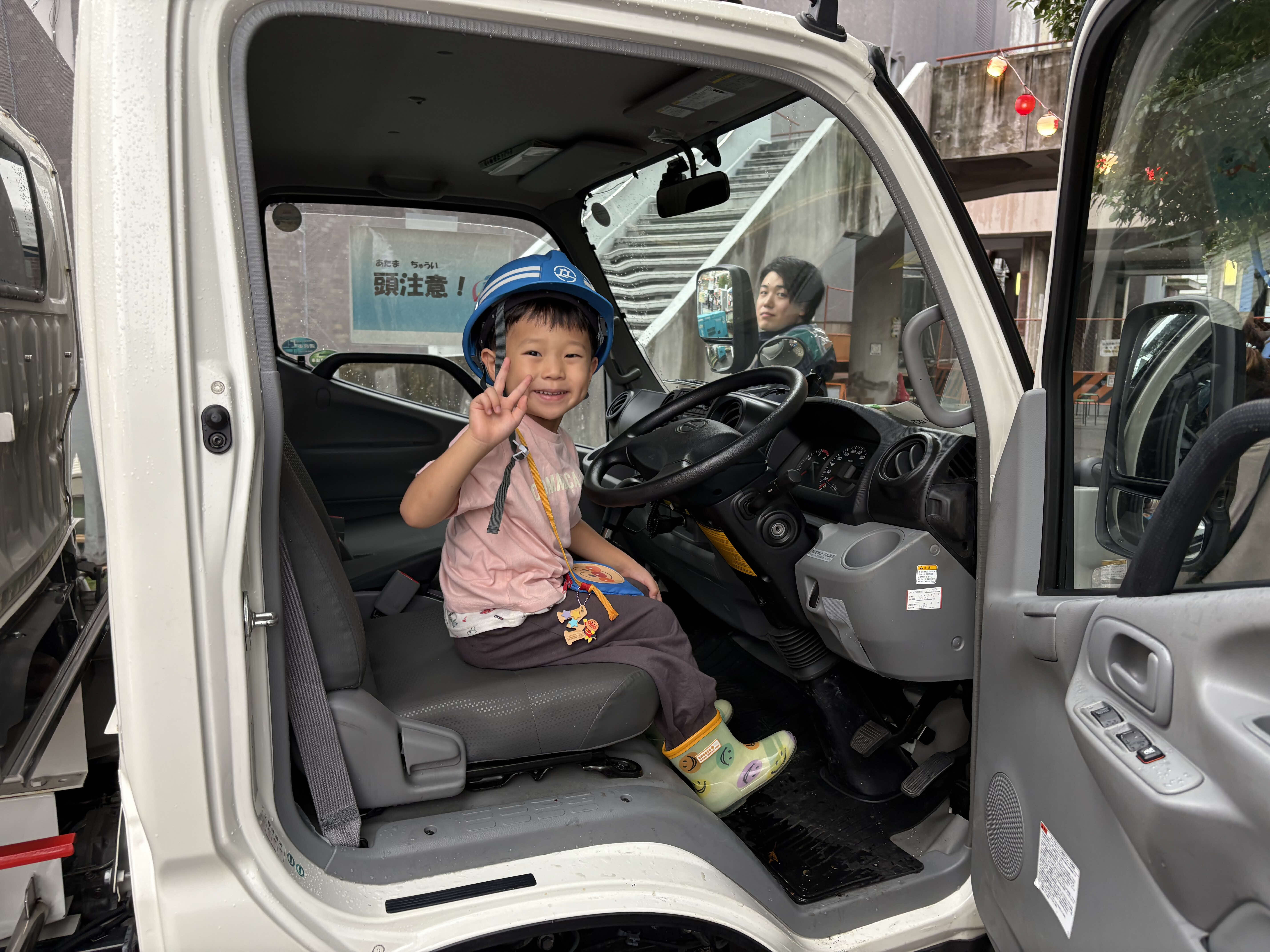 子どもたちには、実際に給水車の運転席に乗っていただき、ヘルメットと無線をお渡ししての記念撮影会も行い、多くの方にご参加いただきました。