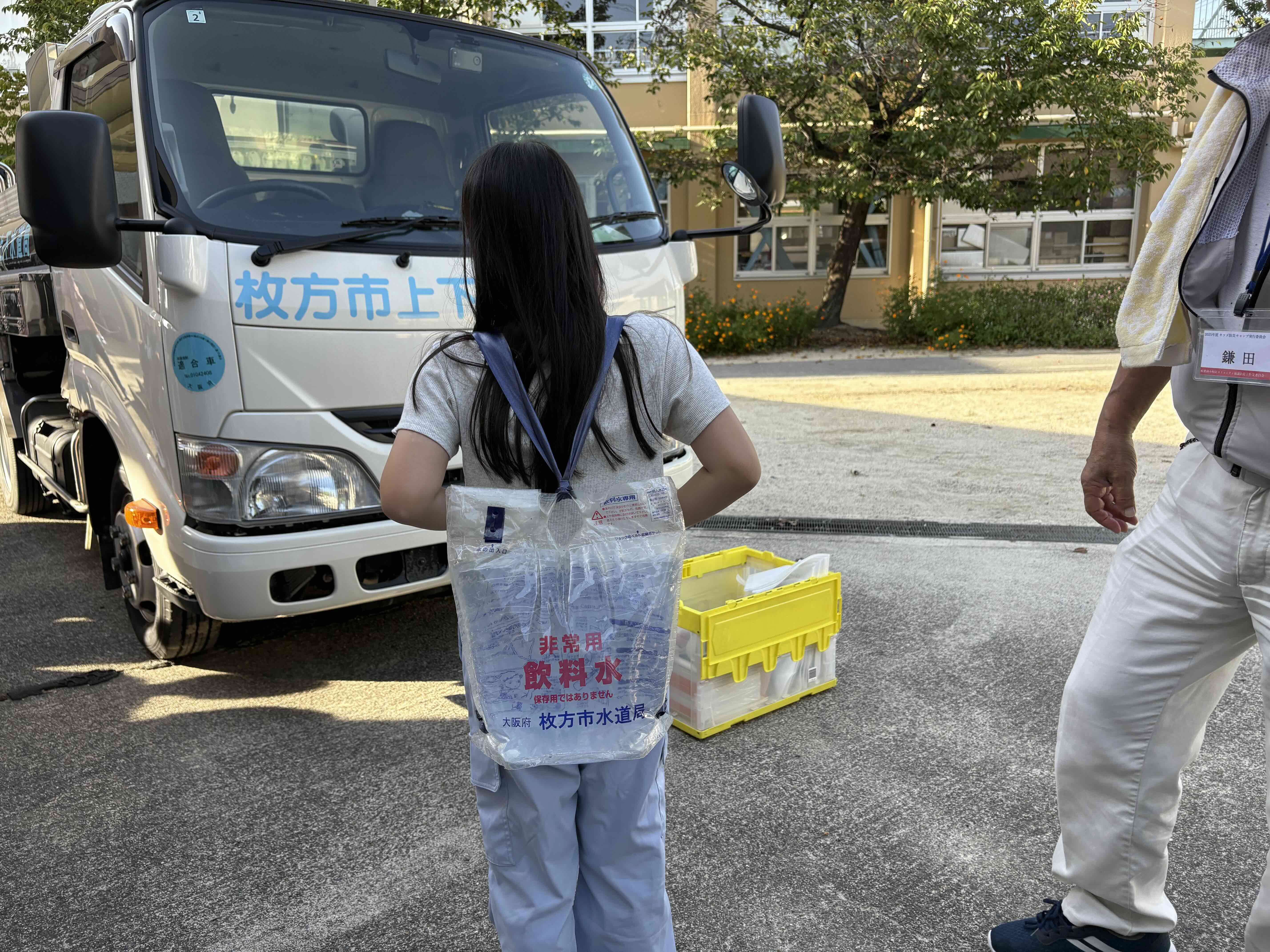 上下水道局職員からは、実際に令和6年1月1日に発生した能登半島地震の際に枚方市上下水道局の給水車を1台派遣し、穴水町において給水活動を実施してきたことや、いつ起こるかわからない災害に備えて、普段から飲み水(一人当たり1日3Lを目安に3日分で9L)を蓄えておくことが大切であることをお話ししました。
