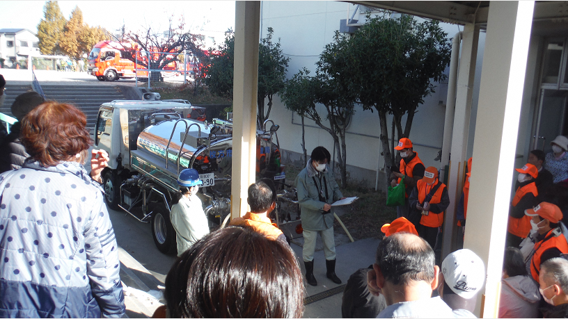 給水車を使用して、実際の災害時で行う給水活動の実演を行い、そこで、多くの参加者の方々に「公助」の部分を見ていただけたのではないかと感じております。また、実演時には「自助」として、自身でも災害時に水や食料などの備えが必要であることも伝えさせていただきました。